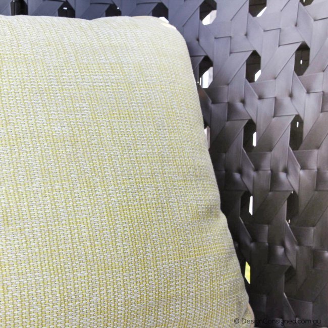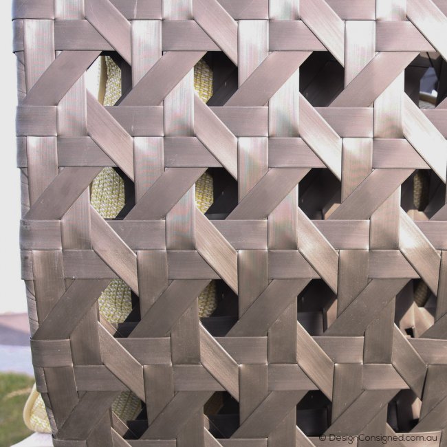 Fabrication Durable aluminium frame with powdercoat finish. High tech sturdy polyethylene woven ribbons in col: bronzed charcoal. Polyurethane inner outdoor seat cushion in fabric Agate col: 100 with piping detail and coordinating back cushions. *Covers removable and reorderable.