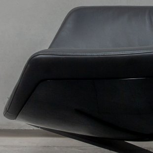 Auckland lounge chair from Cassina is a revolving, futuristic looking, black leather ‘man chair’ with adjustable headrest.