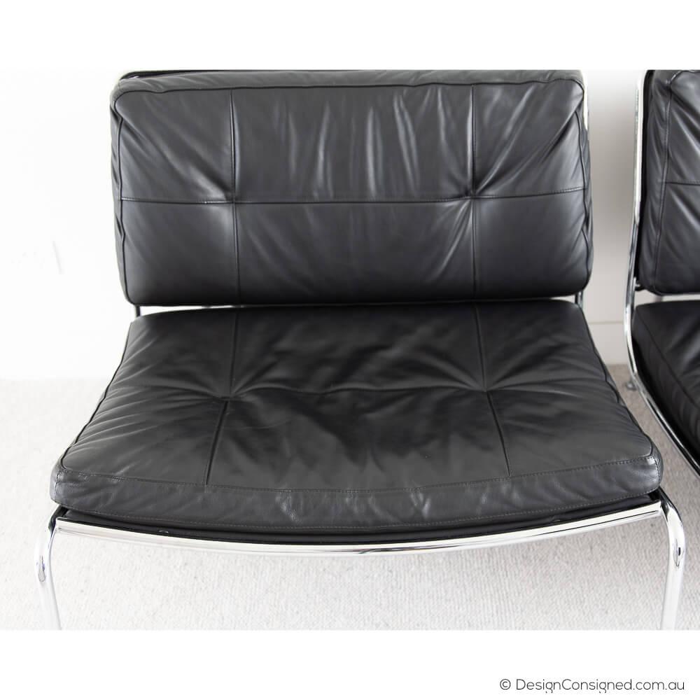 Fabrication Chromed tubular steel frame, metal seat chassis surrounded with cold-expanded polyurethane foam and thermo polyether cover. Back and seat cushions of performed polyurethane responsive foam, acrylic fibre piece covering, non-removable black aniline leather leather upholstery treated to give a soft waxy look and feel and finished with sectioned stitching.