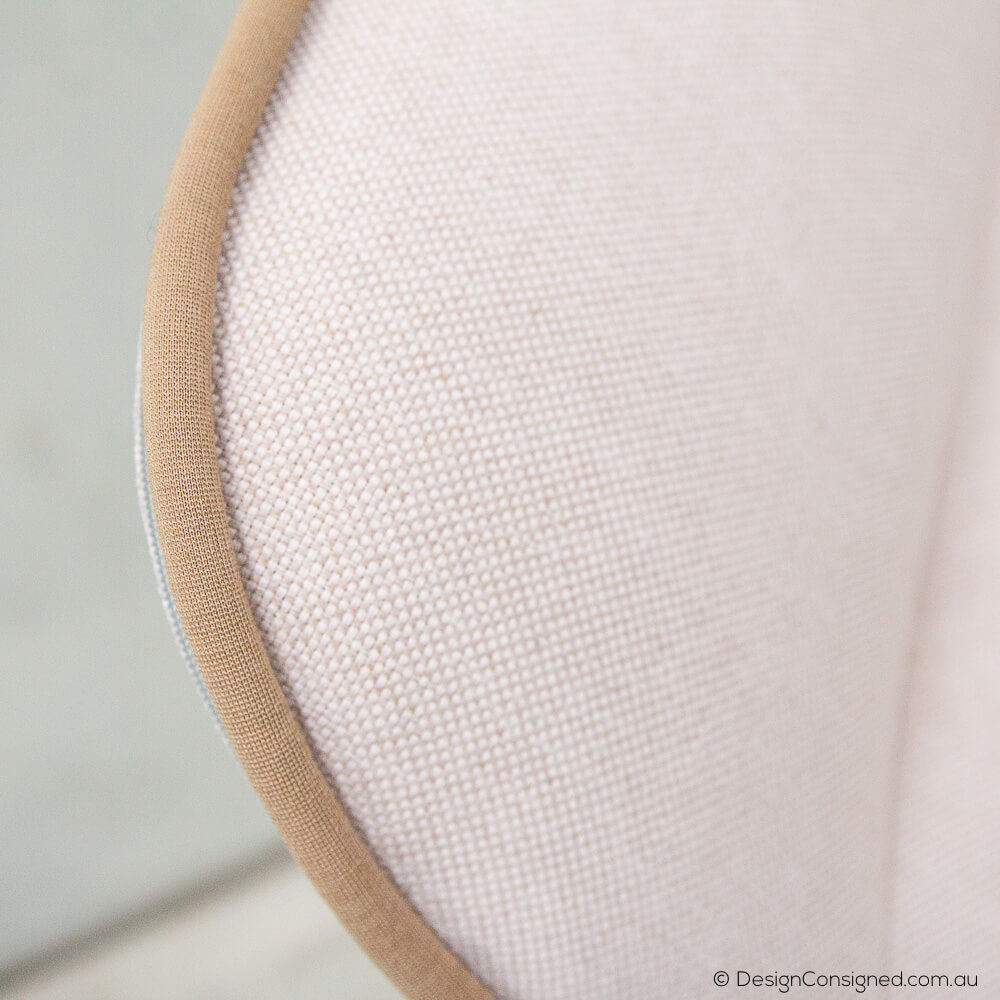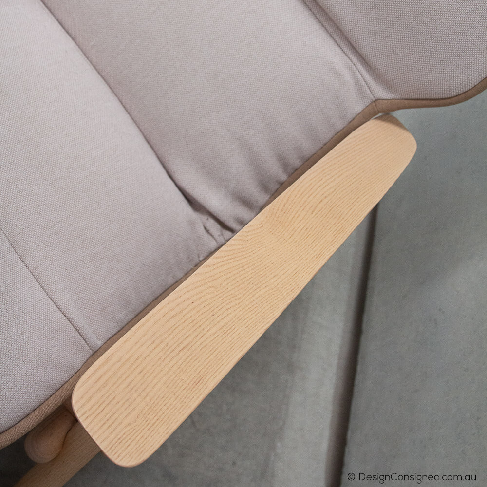 Fabrication Solid European turned oak base frame with natural matt protective finish, steel internal seat frame with flame retardant polyurethane foam padding. Kvadrat Tonus W category upholstery in Col: pale shell pink with stretch jersey edge piping in Col: caramel.
