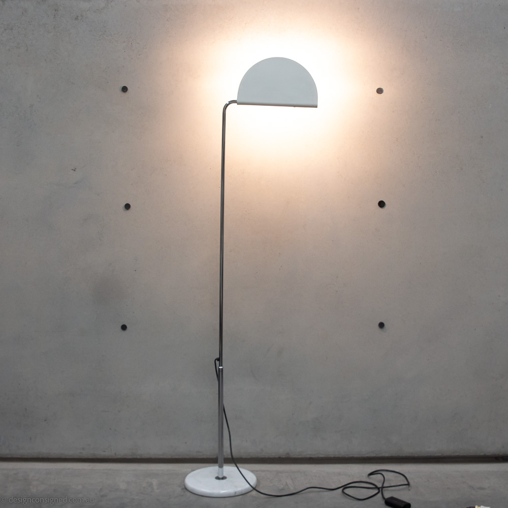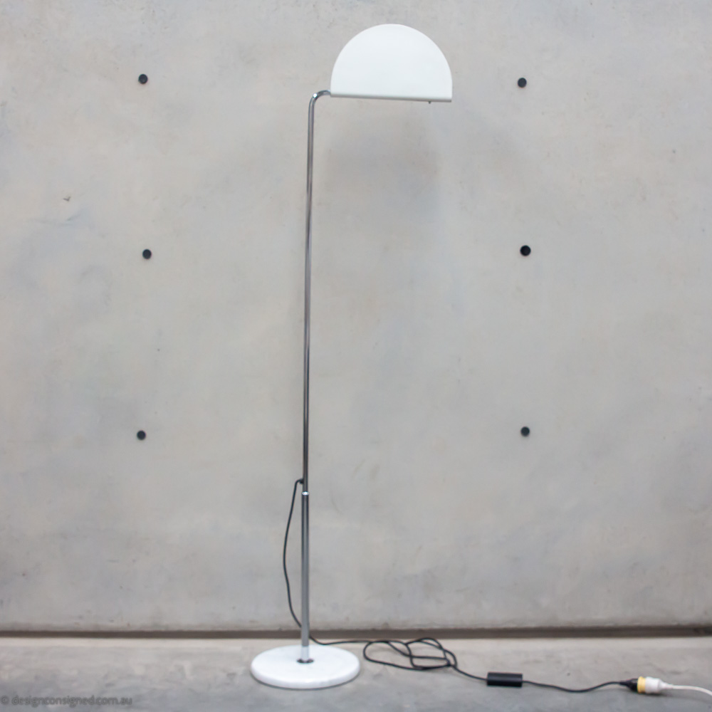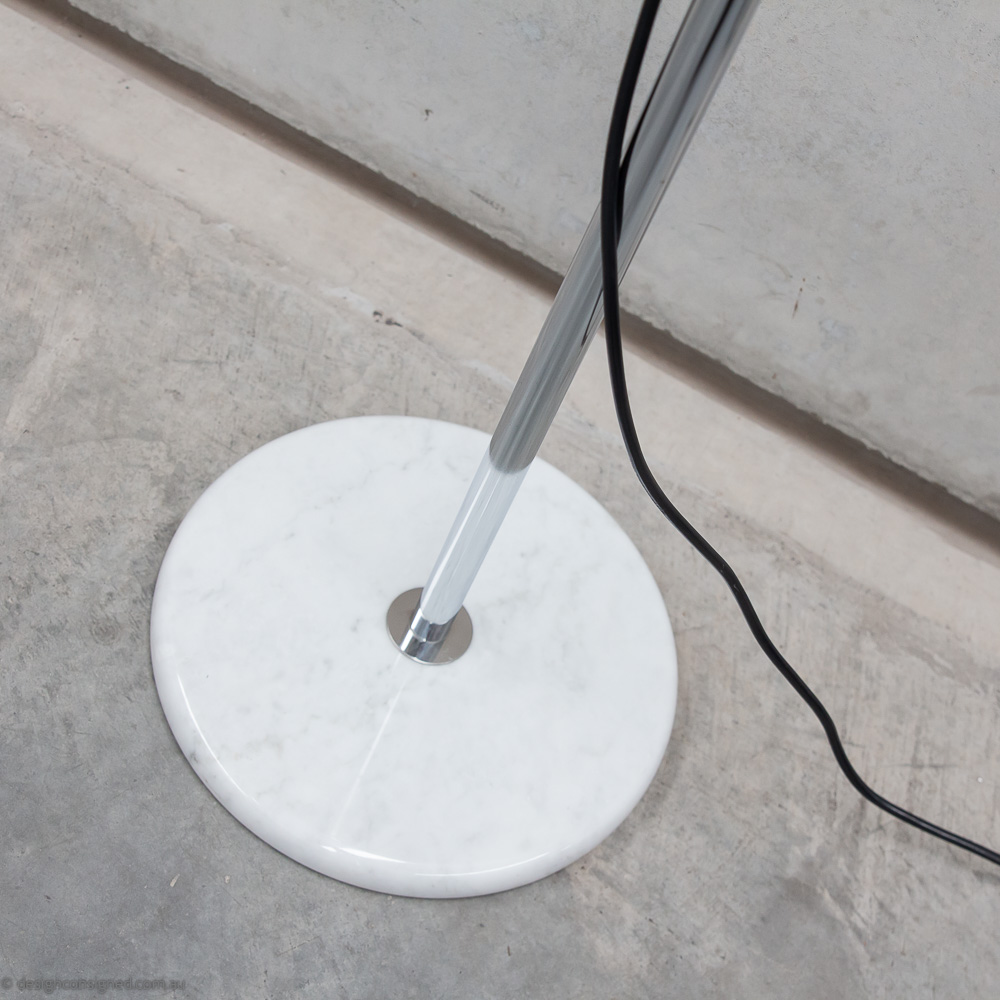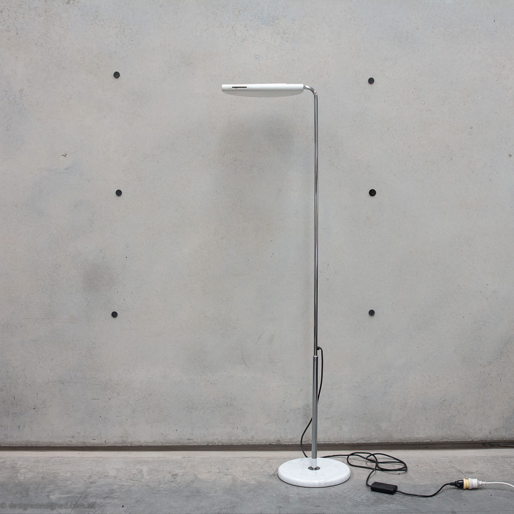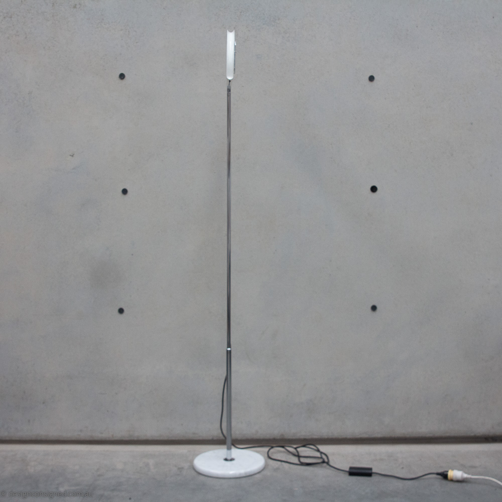 Design Consigned Stylist A cool Mid Century modern floor lamp featuring popular materials of the era, gloss enamelled metal, chrome, and marble. Enjoy the many options this clever floor lamp offers, including, telescopic height adjustment, sliding dimmer function, a pivoting head allows atmospheric uplighting, discreet wall lighting, or direct task lighting.