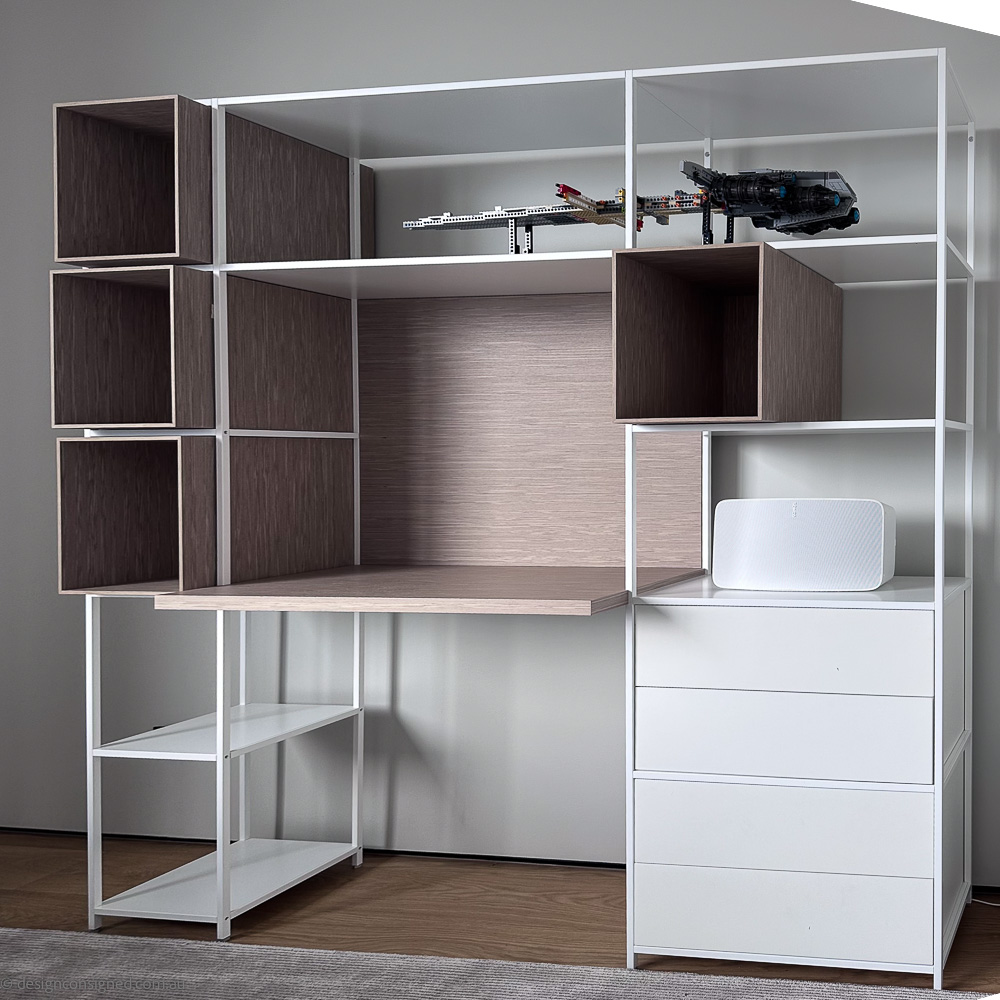 Design Consigned Stylist 90s Minimalism with maximum style. This slim freestanding shelving / desk system is ideal for renters. Add to, or customise, over time. Looks best standing a little away from a wall, or as a room divider. Stylish junior bedroom solution.