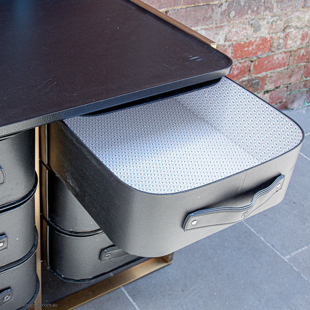 Fabrication Square profile frames in solid brass. Top shelves of wood encased in black leather. Shoe boxes of biodegradable hard cardboard inside an outer casing and are lined with the Sagitine print with exteriors in rose fine rib vinyl with natural leather pulls. The large boot / or men’s shoe boxes are in black with black leather handles.