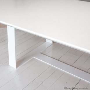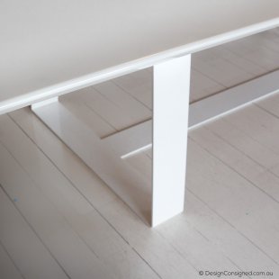 Fabrication Welded steel base with industrial powder coating in white gloss. Single slab 30mm profile timber top with bevelled edges. Plywood substrate. White paint finish.